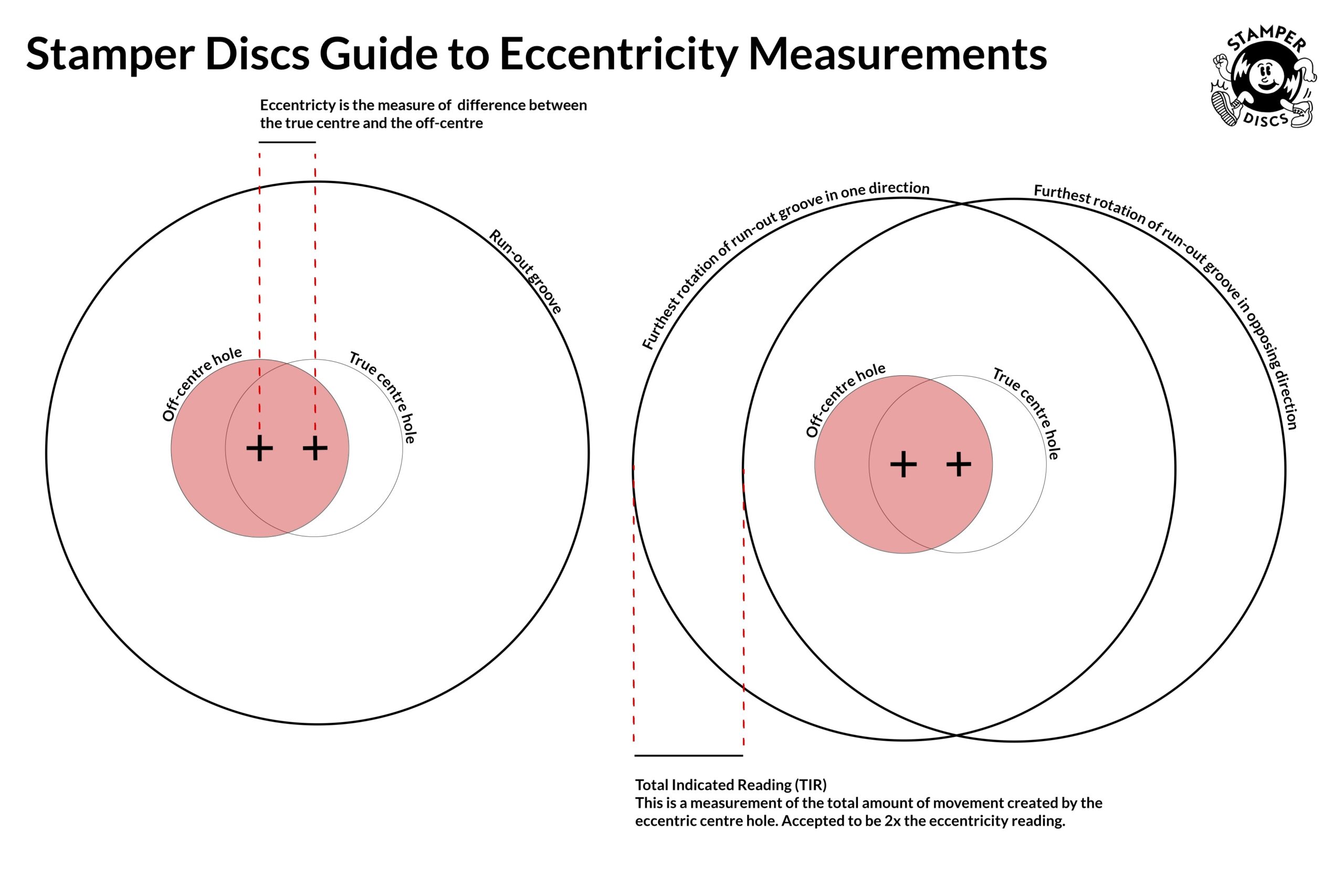 - Eccentricity: the measure of how far off-centre the centre hole is. Expressed in engineering terms, “the degree to which two forms fail to share a common centre”. (In this instance the two forms being the spindle hole at the centre of the record and the grooves containing the audio.)